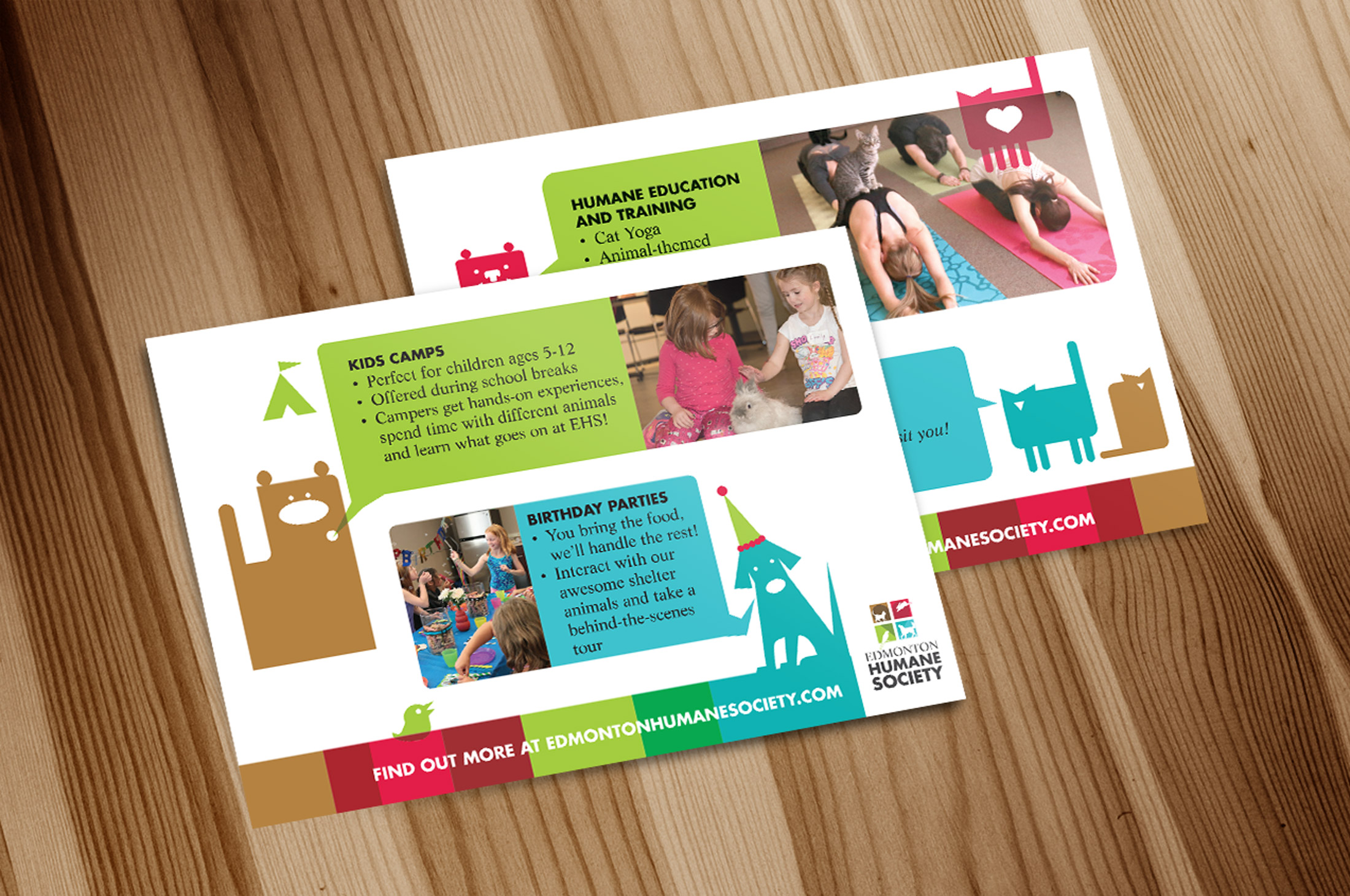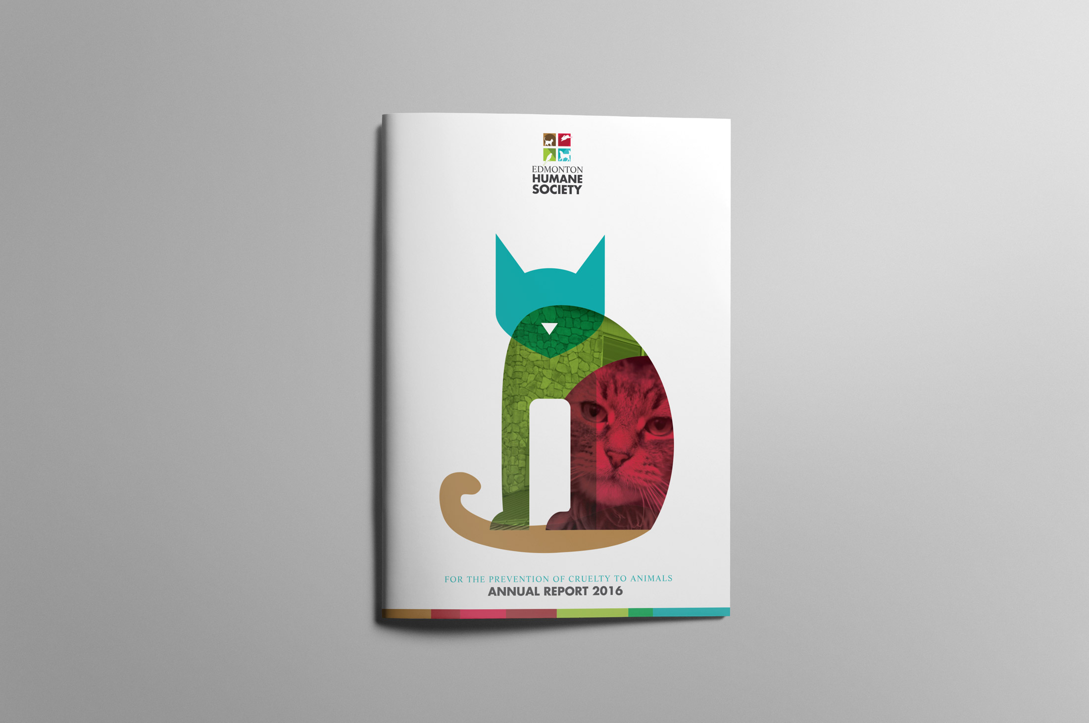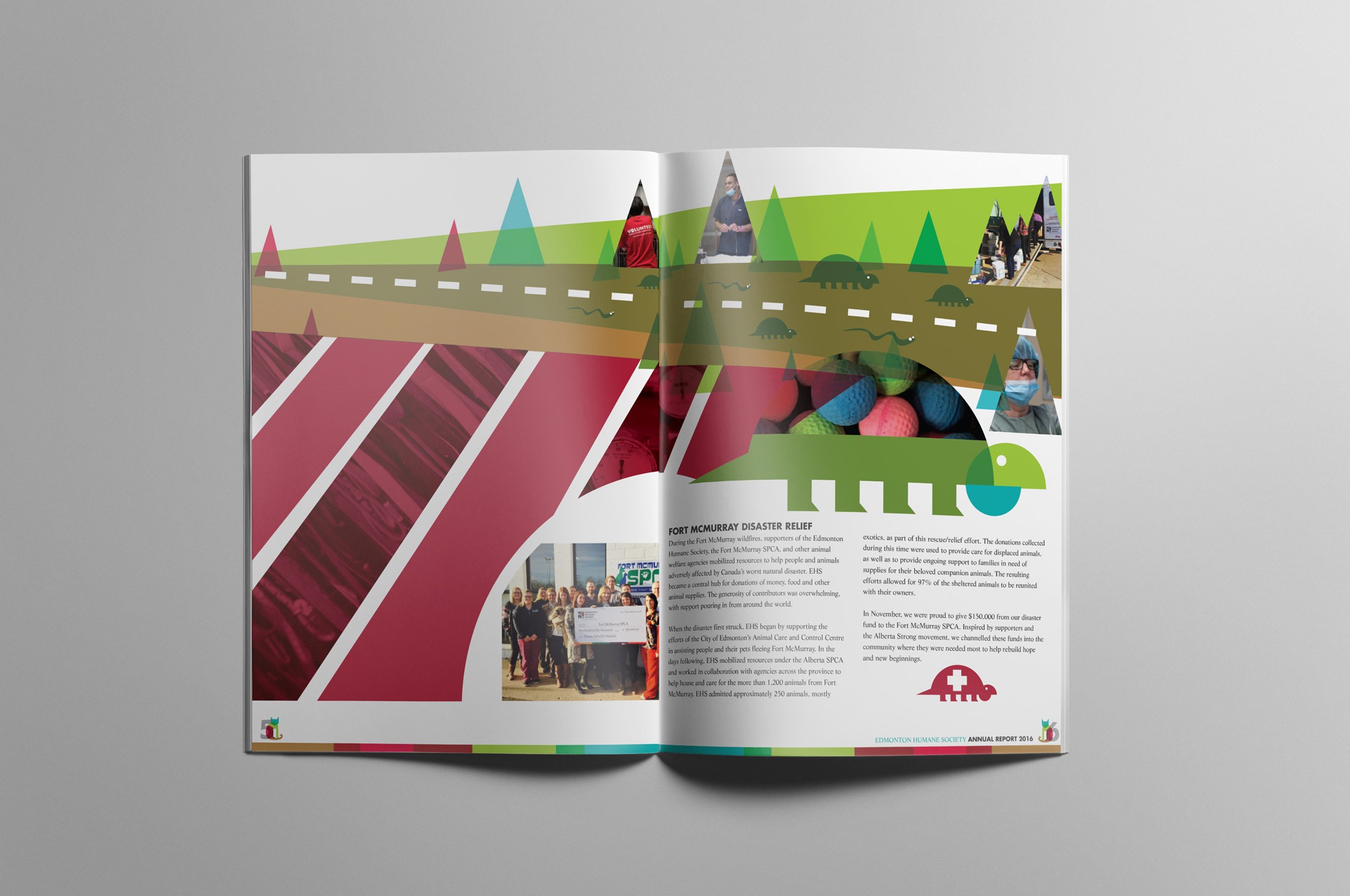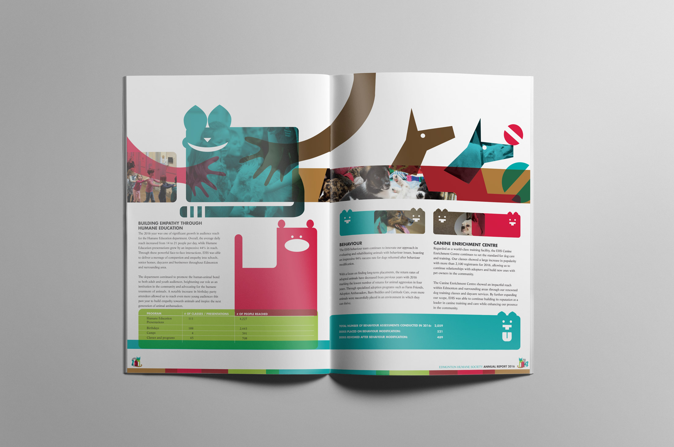 In this Annual Report Design - we focused on showing an animal, not as a whole photograph (as people would normally see it) but as a symbol created out of 4 slightly modified simple shapes. The reason for this is twofold: 1. the 4 shapes mimic the 4 squares in the EHS logo 2. the animal is made up of a digital collage of textures, photos and solid colours which symbolizes the fact that there is a lot more going on at EHS than animals in + animals out.